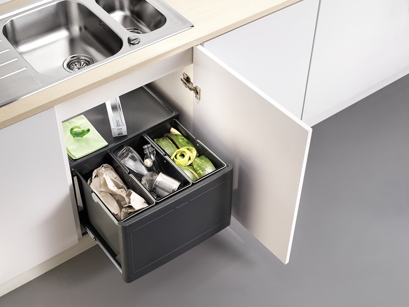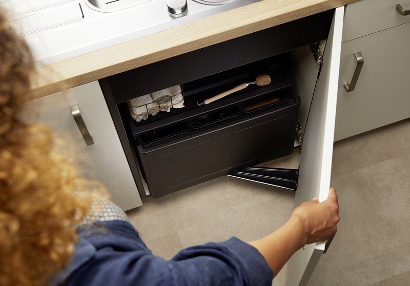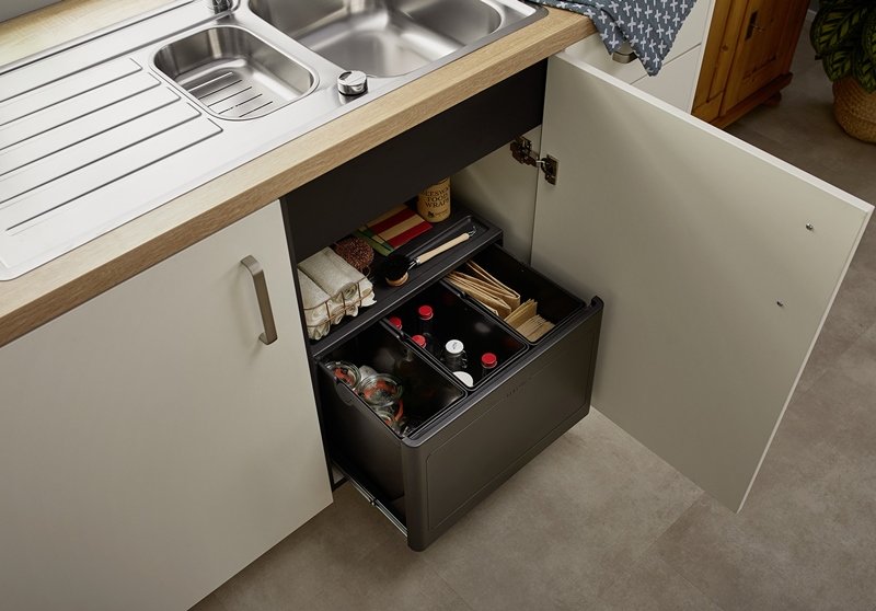 Systém je vhodný aj do kuchýň, kde je dôležitá hygiena a poriadok – nádoby sa dajú vybrať, vyčistiť a vrátiť späť, čo uľahčuje pravidelnú údržbu v skrinke pod drezom.
