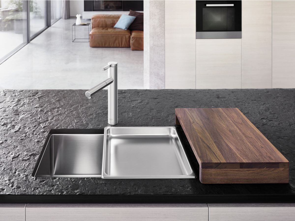 Minimalistický dizajn bez odkvapu podporuje čistú pracovnú plochu a dobre sa kombinuje s rôznymi štýlmi kuchynských batérií – od jednoduchých pákových až po vyššie výsuvné varianty.