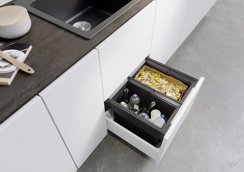 Pri varení a príprave jedla oceníte, že odpad triedite priamo v linke – šupky, obaly či papier skončia hneď v správnej nádobe. Dve samostatné vedrá pomáhajú udržať poriadok bez ďalších voľne stojacich košov v kuchyni, čo je praktické najmä v menších priestoroch.