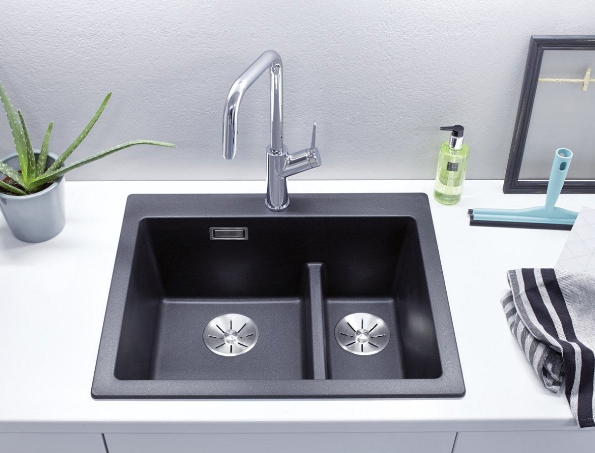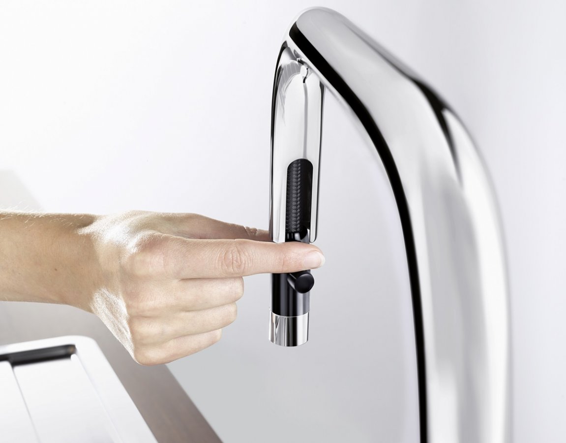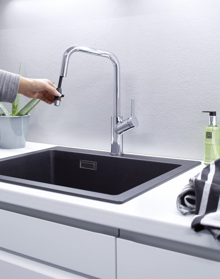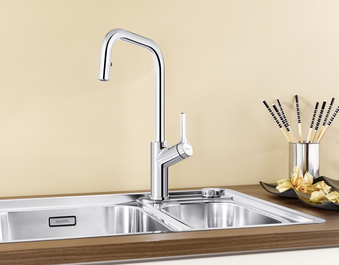 Výsuvná sprška pridáva batérii funkčný charakter bez toho, aby pôsobila rušivo v priestore nad drezom. Pri zladení s kuchyňou funguje dobre ako univerzálna batéria do kuchyne k nerezovým aj kompozitným drezom Blanco.