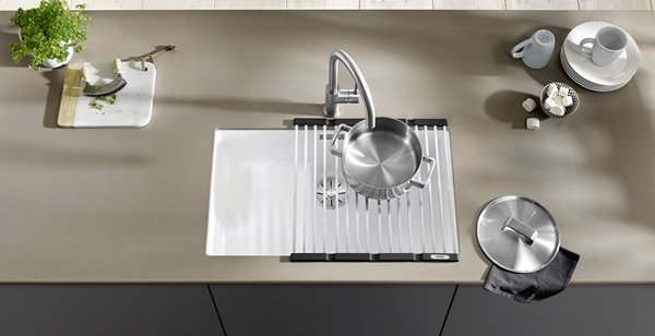 Pri umývaní riadu vytvorí mriežka odkvapkávaciu zónu priamo nad vaničkou: poháre a príbory schnú nad drezom a voda steká späť, takže nemusíte riešiť mokré fľaky na doske.