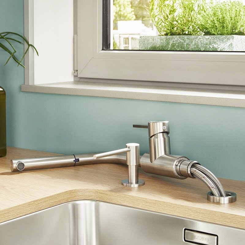 Blanco Lanora S-F (526180) je moderná kuchynská batéria v prevedení leštená nerez, navrhnutá pre pohodlné každodenné používanie pri dreze. Vďaka vyhotoveniu pred okno sa hodí aj do kuchýň, kde je batéria umiestnená pri okennom krídle a potrebujete zachovať možnosť jeho otvárania. Praktická výsuvná sprška zjednoduší oplachovanie riadu aj čistenie samotného drezu.