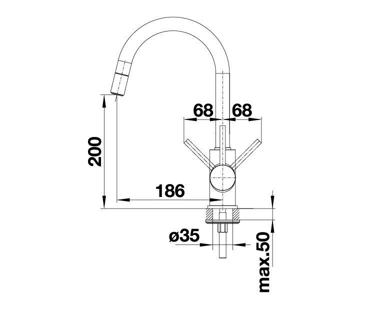 Montáž prebieha do otvoru s priemerom 35 mm, čo je najbežnejší rozmer v kuchynských drezoch a pracovných doskách. Celková výška batérie 336 mm poskytuje pohodlný priestor pod výtokom, takže sa ľahšie manipuluje s vyššími hrncami či plechmi.