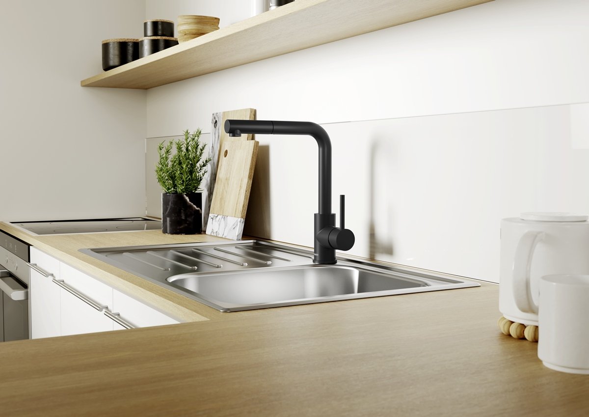 Výsuvná sprška výrazne uľahčí každodenné činnosti: rýchlo opláchnete sitko, dosku na krájanie aj drez po varení, prípadne pohodlne napustíte vedro postavené vedľa drezu. Plná otočnosť ramienka je praktická aj pri väčšej pracovnej ploche – výtok si viete odsunúť z priestoru, keď pri dreze pripravujete jedlo, alebo ho natočiť presne tam, kde potrebujete prúd vody.