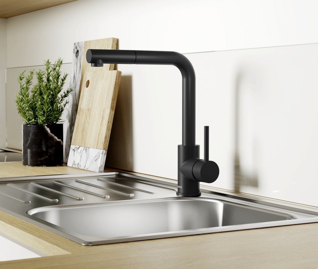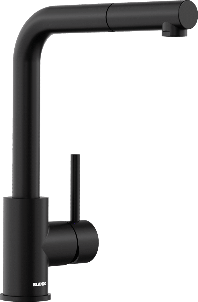 Blanco Mila S Metalická batéria v čiernej matnej farbe je praktická batéria do kuchyne s výsuvnou sprškou, určená na každodenné umývanie riadu aj oplachovanie surovín. Vďaka vysokému ramienku a plnej otočnosti sa hodí najmä k väčším drezom alebo k riešeniam, kde sa pri dreze často pracuje s objemnými hrncami. Pákové ovládanie uľahčuje rýchle nastavenie teploty a prúdu vody jednou rukou.