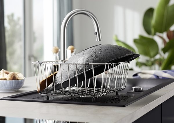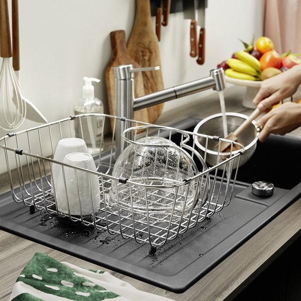 Tvar je navrhnutý tak, aby kôš slúžil ako funkčný odkladací priestor bez toho, aby zbytočne zavadzal pri práci v dreze – v kuchyni tak získate viac kontroly nad tým, čo sa suší, čo sa oplachuje a čo je pripravené na odloženie.