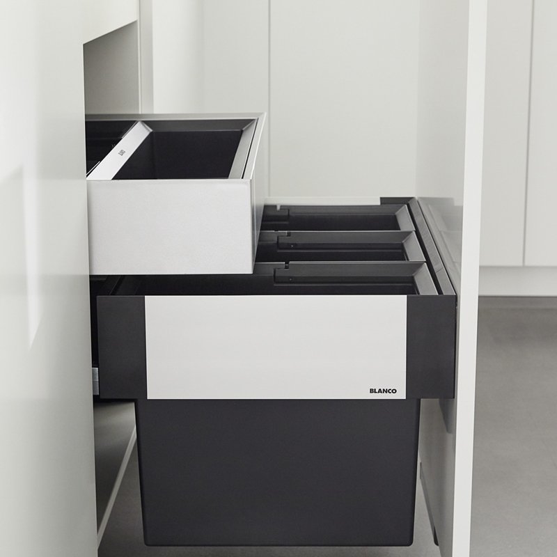 Blanco Select II 60/3 ORGA (526209) je praktický odpadkový kôš do kuchynskej linky určený na montáž na dvierka skrinky. Ponúka tri samostatné nádoby s objemom 3 × 15 l, vďaka čomu uľahčuje triedenie odpadu priamo pri pracovnej zóne. Hodí sa najmä do bežných domácností, ktoré chcú mať smetný kôš skrytý, no stále rýchlo dostupný.