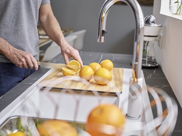 Pri krájaní zeleniny môžete dosku položiť nad vaničku a priebežne oplachovať suroviny bez toho, aby ste zaberali miesto na linke. Zvyšky a šťavy skončia v dreze, takže upratovanie je rýchlejšie.