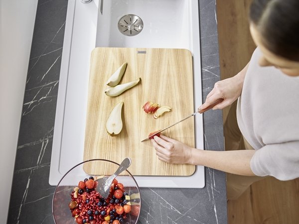 Doska je určená na použitie priamo na dreze Blanco Zenar XL 6 S – typicky sa ukladá na okraj drezu (resp. na integrované dosadacie plochy podľa konštrukcie modelu). V praxi to znamená, že získate stabilnú „mini pracovnú dosku“ nad vaničkou: šťavy a drobné zvyšky môžete jednoducho zhrnúť rovno do drezu a pracovná doska kuchynskej linky zostáva suchšia.
